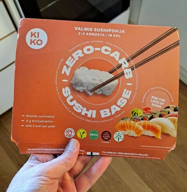Arvio: Toimiva tuote tilanteessa, jossa riisiä ei voi tai halua syödä. Nälkään en näitä söisi, eikä se taida olla tarkoituskaan. Sushitunnelmaan tuotteella pääsee hyvin, mutta lähes 10 €:n hinta (300 g) on liikaa. Konjac-mukulan luontojalanjälki on riisiin verrattuna pieni, muttei tätä lähituotteeksi voi sanoa. Tuulivoimalla tuotetulla KIKO:lla on Sydänmerkki ja V-label. Sopii ketoilijoille ja pakkauksessa mainitaan tuotteen nauttimisen edistävän painon- ja kolesterolin hallintaa.