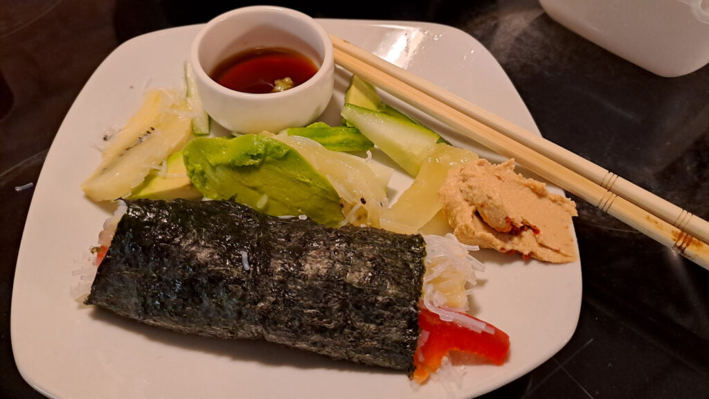 Kokeilin puolet nuudelista sellaisenaan ja toisen puolen silppusin veitsellä pieniksi riisinjyvien tapaan. Kummassakin tapauksessa lopputulos jää liian pehmeäksi rullaan. Täytteiksi valikoituneet, keltainen kiivi, banaani, paprika , kurkku ja avokado tursusivat pois rullasta käärimisen aikana. Brikettejä tai solmuja en onnistunut liukkaista nuudeleista saamaan. Sotkuista hommaa. Hyvän makuinen lopputuloksesta tuli, mutta ruma.