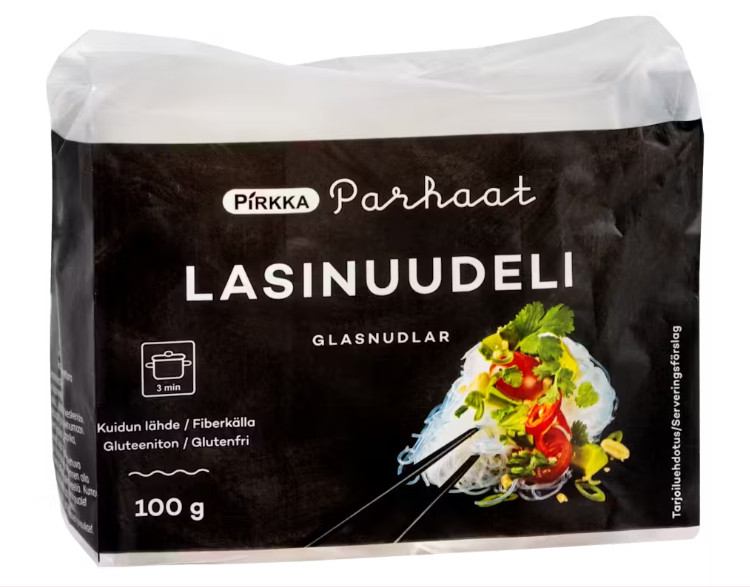 Mungpapu- ja hernetärkkelyksestä sekä vedestä kokoonkeitettävästä massasta Thaimaassa valmistetut Pirkka lasinuudelit ovat konjac-pohjaisten tapaan vaaleita ja siimamaisia. E-koodeja ei tuoteselosteesta löydy. Tärkkelyspohjassa on huomattavasti enemmän hiilihydraatteja kuin konjac-juuressa, vaikkeivät nämä vehnäpohjaisten hiilaritasolle yllä.