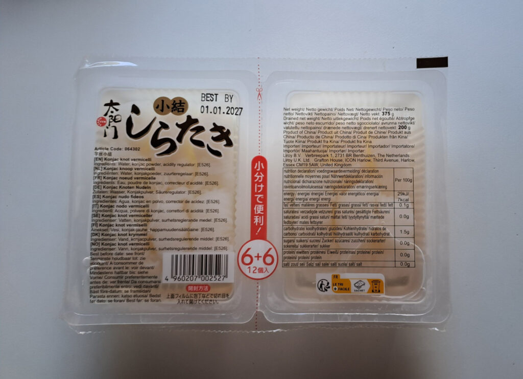 Paikallisen Aasia-marketin valikoimasta löytyi kiinalaisvalmisteinen shirataki-nuudeli, joka myytiin KIKO:n tapaan valmiina annospaloina. Kypsästä nuudelista narukerän tapaan kiedotut ”palat” ovat pakkauksessaan kirkkaassa nesteessä. Ainesosaluettelo on vielä lyhyempi kuin edellisessä. Konnyak (konjac) -jauhe, kalsiumhydroksidi ja vesi. E-koodeja ei mainita, vaikka kalsiumhydroksidi tunnetaan myös nimellä E526. Jos oikein ymmärsin, E-koodia ei kuitenkaan enää valmiista tuotteesta löydy. Edellisen tapaan energiaa on vähän. 7 kcl / 100 g. Tuotteen valmistaa TYM, eli kiinalainen TaiYangMen, joka valmistaa white label tuotteita moniin maihin kauppojen ja maahantuojien itse brändättäväksi. Testipakkauksesta ei löytynyt mitään brändiä ja tuoteselostekin oli kiinaksi, osa japaniksi ja englanniksi