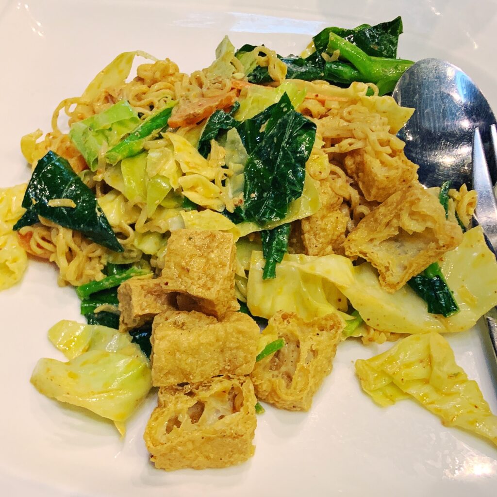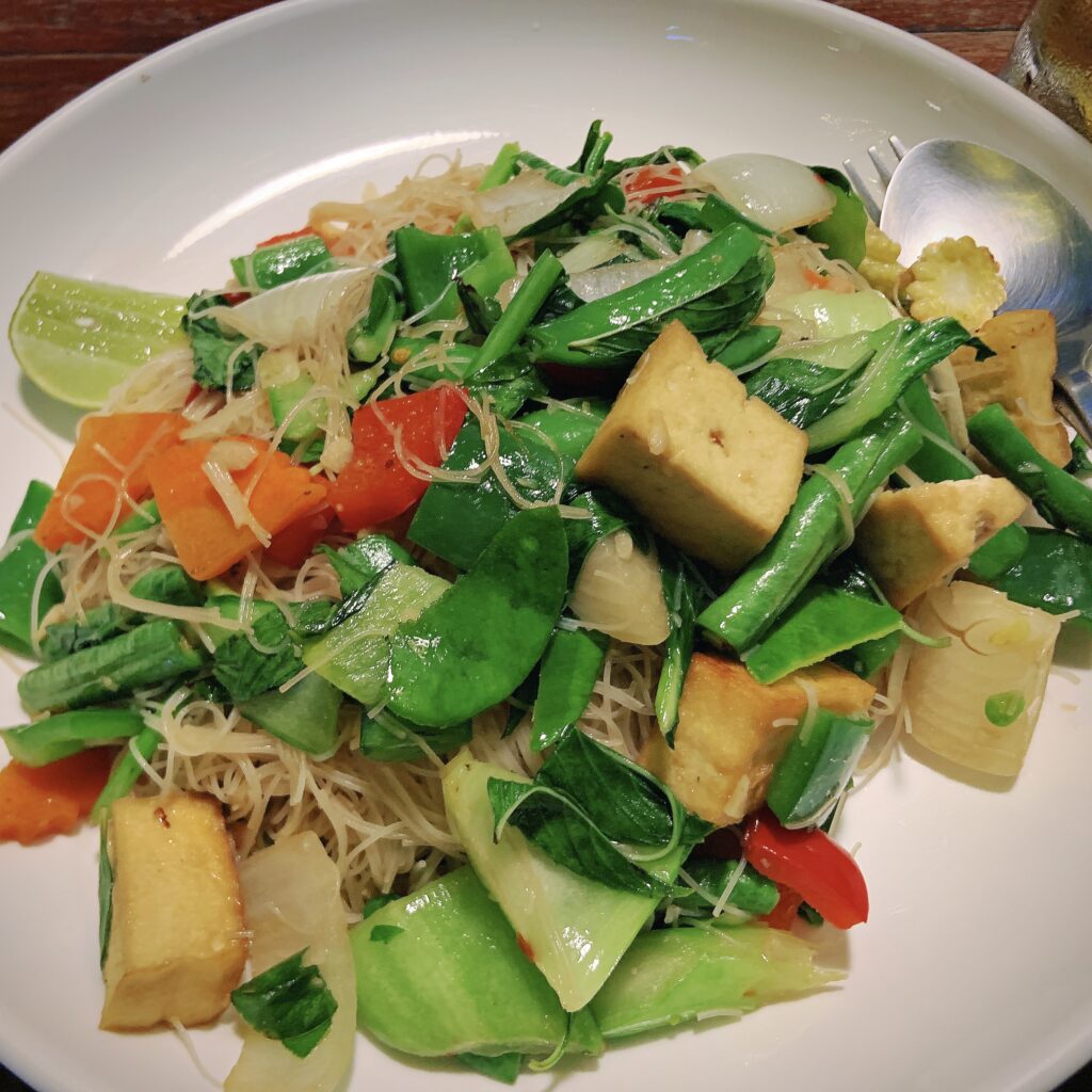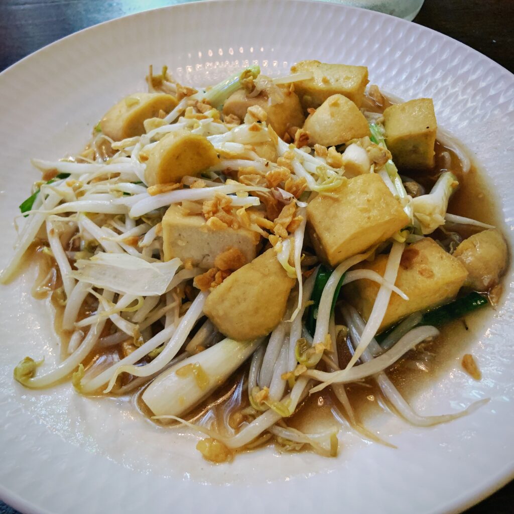 Ruokalista on varsin pitkä ja sisälsi lukuisia lähes samanlaisia annoksia. Tofun ohella proteiineina annoksissa oli ”veggie chicken”, ”veggie pork” ja ”veggie duck”. Tarkempaa tietoa niistä ei ollut, että mistä ne oli tehty ja kielimuurin vuoksi en edes yrittänyt kysyä. Ihan kaikki listalla ei ollut täysin vegaanista, siilä joihinkin annoksiin oli valittavissa munanuudelit. Tilasin paistetut nuudelit veggie chickenillä. Annoksen hinta ei päätä huimannut, 70 bahtia eli noin 1,87 €.