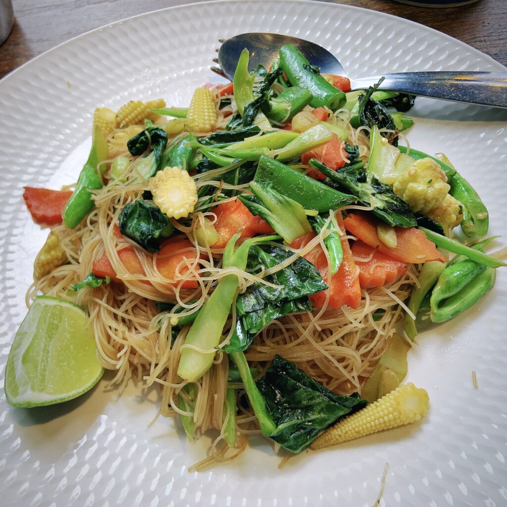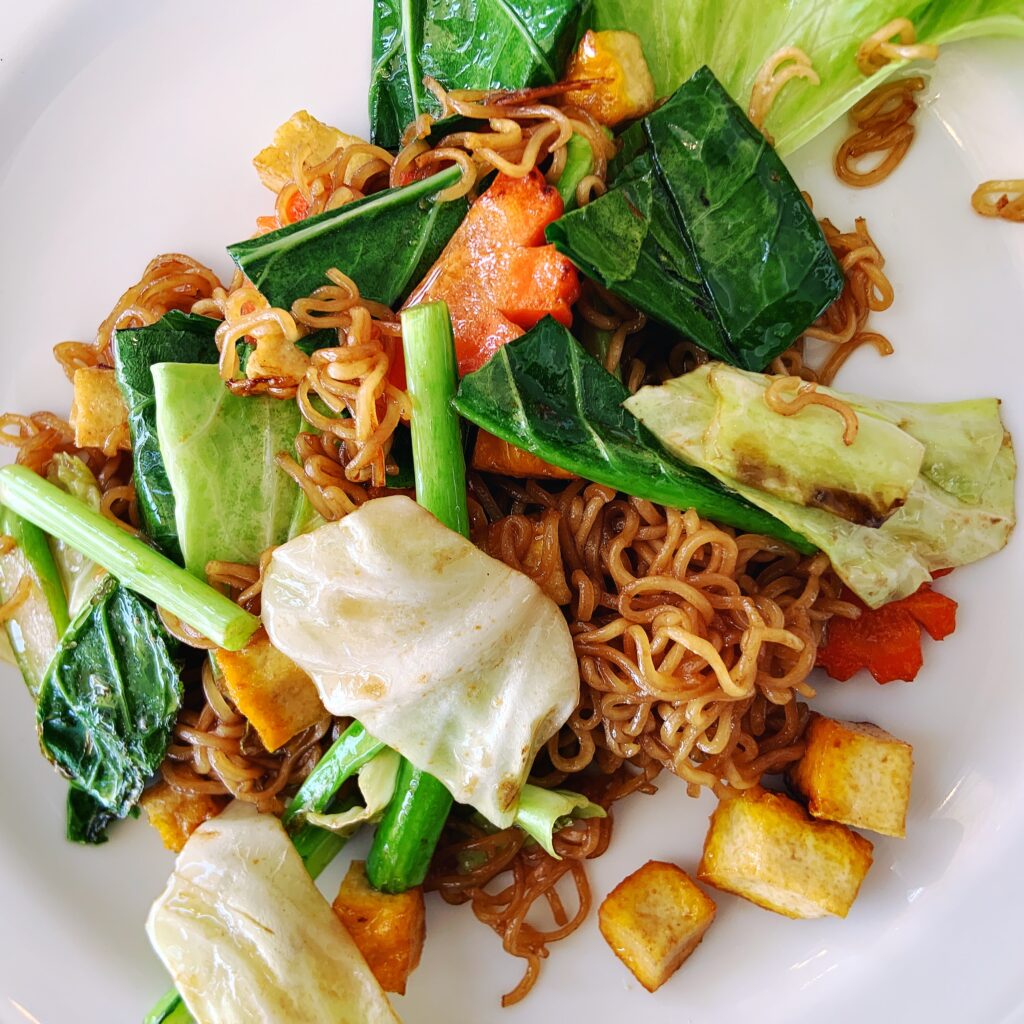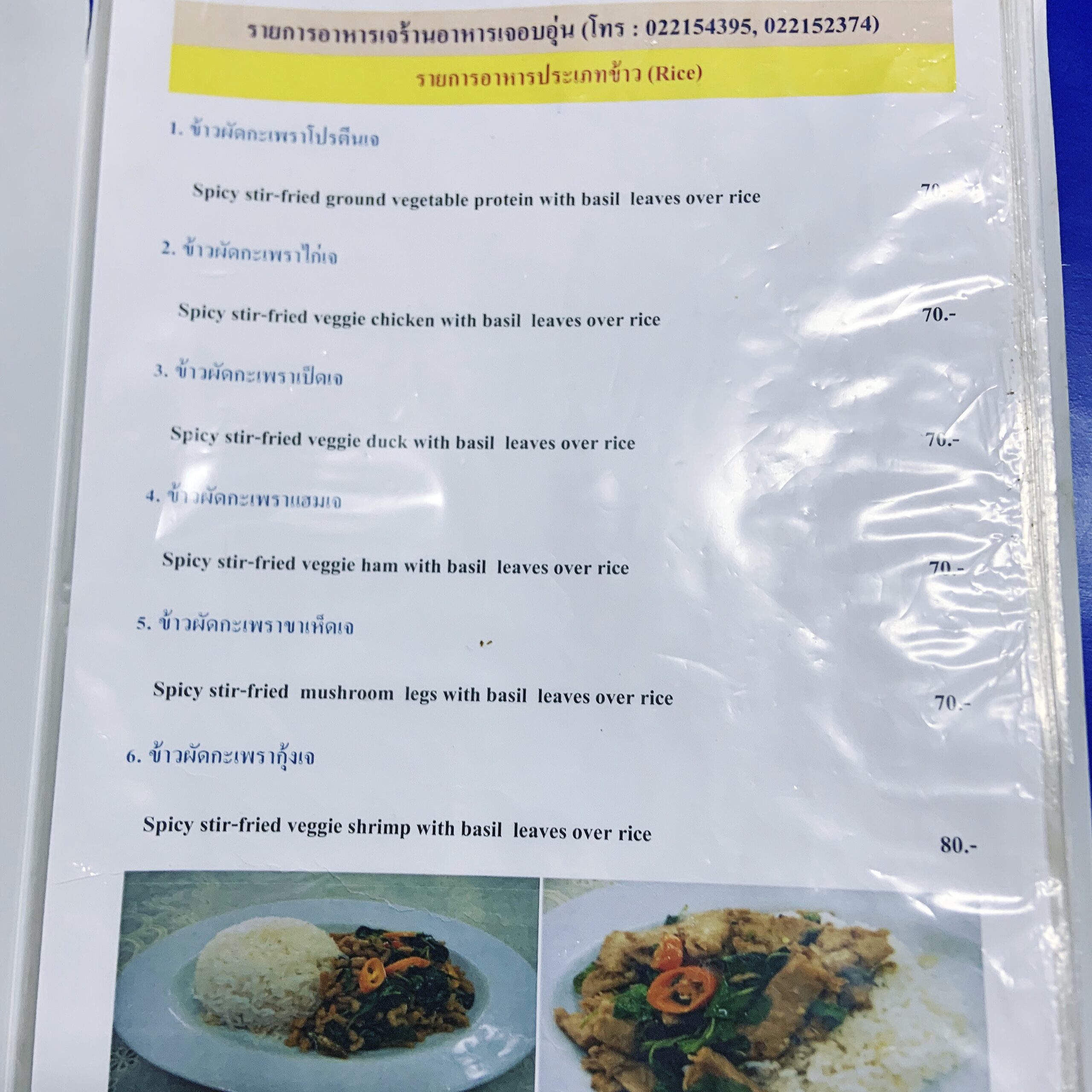 Ruokalista on varsin pitkä ja sisälsi lukuisia lähes samanlaisia annoksia. Tofun ohella proteiineina annoksissa oli ”veggie chicken”, ”veggie pork” ja ”veggie duck”. Tarkempaa tietoa niistä ei ollut, että mistä ne oli tehty ja kielimuurin vuoksi en edes yrittänyt kysyä. Ihan kaikki listalla ei ollut täysin vegaanista, siilä joihinkin annoksiin oli valittavissa munanuudelit. Tilasin paistetut nuudelit veggie chickenillä. Annoksen hinta ei päätä huimannut, 70 bahtia eli noin 1,87 €.