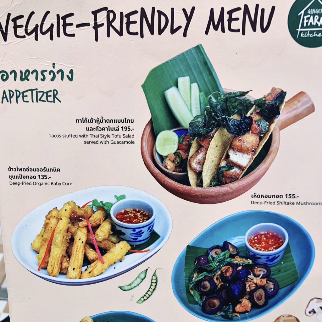 Hätäisenä Plan B:nä päätin vaan mennä One Bankgkok -ostoskeskukseen ja katsoa mitä sieltä löytyy. Olinhan menossa sinne joka tapauksessa, koska ruokakaupassa tarvi käydä. Hetken aikaa palloiltuani törmäsin Ginger Farm Kitcheniin ja silmäni osuivat tyrkyllä olevan ruokalistan välistä pilkistävään ”Veggie-Friendly Menuun”. Paikka vaikutti painottavan kovasti luomua ja lähituotantoa. Seinät olivat täynnä ”Our eggs are happy” -tyyppisiä sloganeja ja muuta viherpesuhöttöä. Pisteet silti siitä, että oli kuitenkin vegaaniystävällinen ruokalista olemassa ja että myös ruoat siellä vaikuttivat olevan vegaanisia, ei näkynyt munaa tms. mitä useiden muiden ravintoloiden ”vegetarian friendly” -vaihtoehdoissa on.