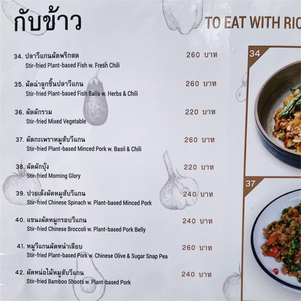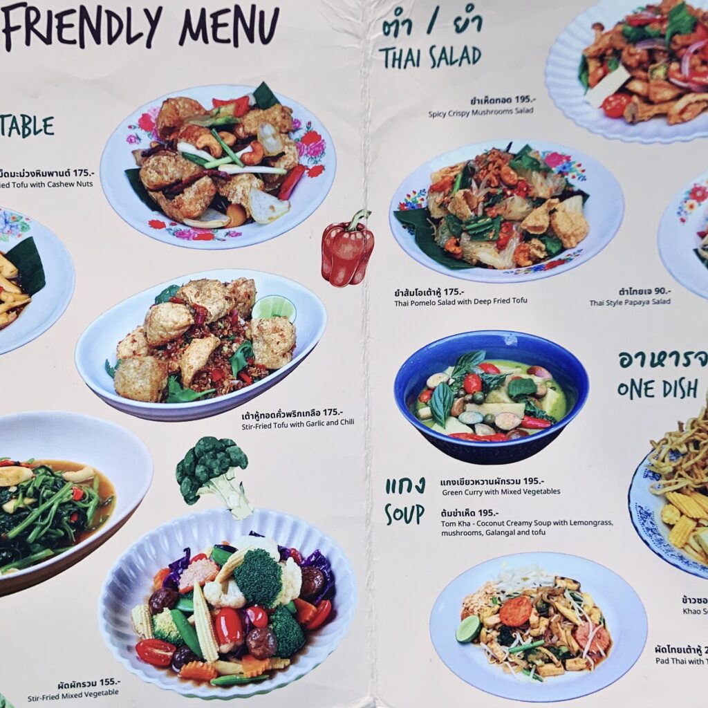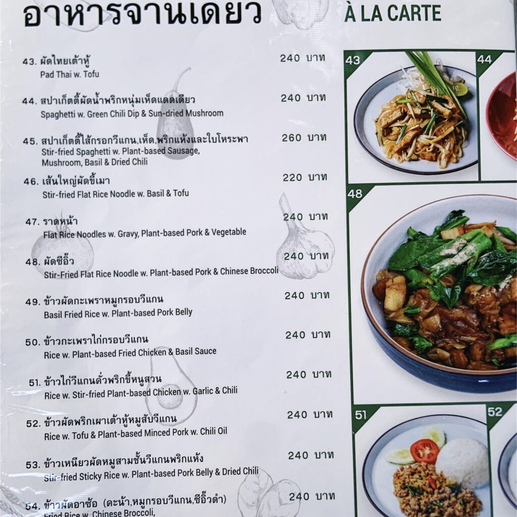 Paikka oli varsin kivan ja viihtyisän oloinen. Hinnoiltaan se oli selkeästi aikaisempia kalliimpi, pääruokien hinnat olivat haarukassa 250-400 bahtia, eli noin 6,70 – 10,70 €. Koetin kysellä tarjoilijalta, että mitä kasvisproteiinia mihinkin vegaanivaihtoehtoon tulee, sillä olisin kovasti halunnut kokeilla paikallista kanankorviketta. Harmikseni tarjoilija oli vain tuuraamassa eikä tiennyt annosten sisällöstä hölkäsen pöläystä.