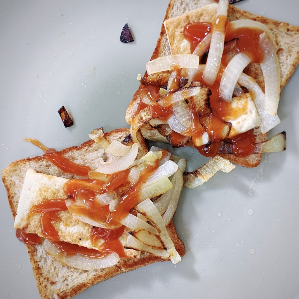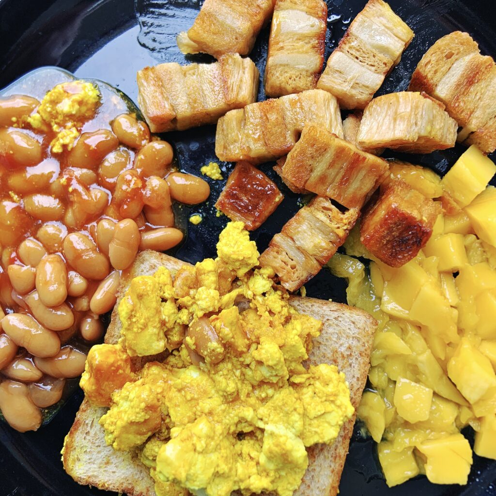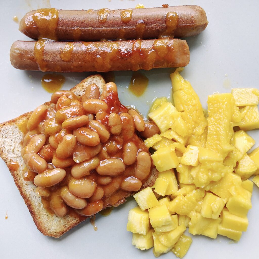 Varsin myöhäiseksi aamiaiseksi (klo 13:20!) laitoin tofukokkelia, paahtoleipää ja valkoisia papuja tomaattikastikkeessa. Aika perinteinen setti siis. Tofuna käytin aiemmin ostamaani japanilaista tofua, jonka pakkauksessa kyllä luki ”firm”, mutta ei se ollut kiinteää nähnytkään. Koostumus oli ihan selkeä silken-tofu. Mausteiksi ei ollut tavallisesti tofukokkeliin käyttämääni kurkumaa ja kala namakia, joten laitoin suolan ohella paprikajauhetta ja paikallista mausteseosta. Ihan syömäkelpoista siitä tuli kuitenkin!