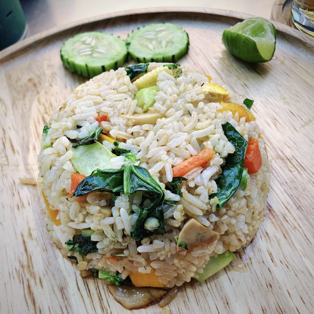 Ensimmäinen työpäivä kului nopeasti ja pian oli taas nälkä. Suuntasin seuraavaan lähiravintolaan Bai Booniin, jonka ruokalistaa olin kauppareissulla myös pikaisesti vilkassut. Menulta löytyi muutamia kasvisannoksia, mutta esimerkiksi kaikki paistetut riisit ja nuudelit on listattu ainoastaan vaihtoehdoilla Chicken/Pork/Shrimp. Oman kokemukseni pohjalta Kaakkois-Aasian maiden ravintoloiden ruokalistat ovat kuitenkin varsin joustavia ja periaatteessa mitä vaan saa kun pyytää. Kysyin siis, että saisiko paistetun riisin tofulla johon tarjoilija tuumasi, että tottakai! Varmistin taas, ettei siinä ollut munaa tai muuta eläinperäistä. Tarjoilija tajusi heti mistä oli kyse ja kertoi, että ei ole munaa eikä kalakastiketta. Annos oli ihan maukas, mutta vähän pieni. Ei se missään nimessä huono ollut 3,29 € hintaan, mutta pieni pettymys edellisen illan superhyvään nuudeliannokseen verrattuna.