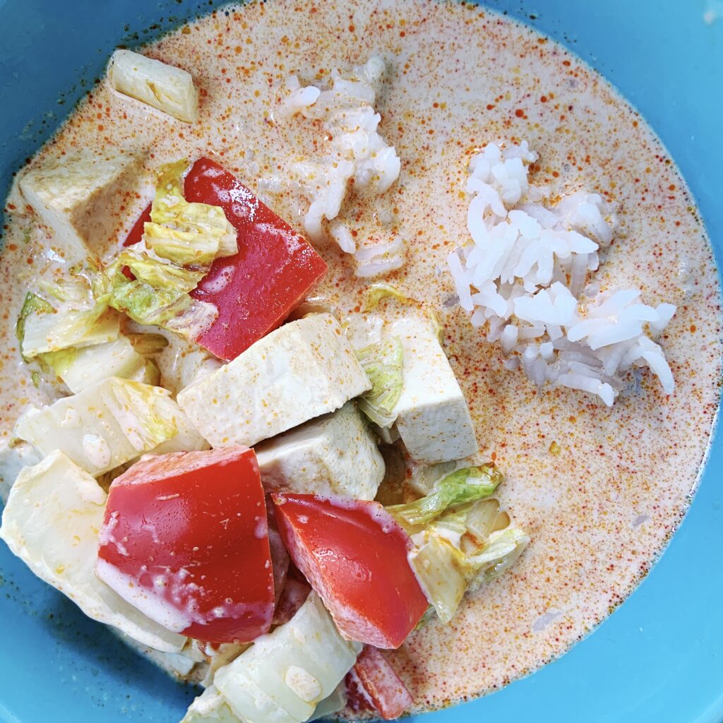 Sunnuntaina tein aamiaiseksi panang-currya tofulla ja kasviksilla. Riisiä yritin keittää niin, että siitä riittäisi myös paistettavaksi myöhemmin. Kokkailu majoituksessa osoittautui hieman haastavaksi, tai ainakin hitaaksi, sillä keittolevyjä oli vain yksi. Onneksi ei ollut kiire minnekään. Currystä tuli varsin maukasta!