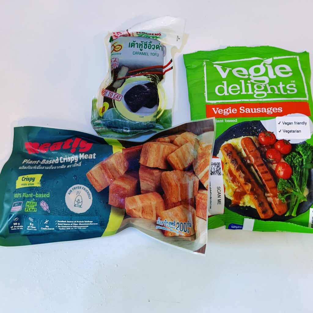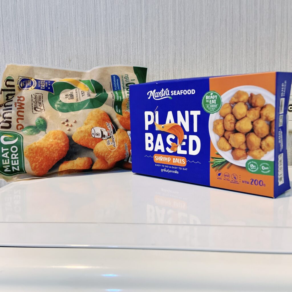 Kauppareissulla Tops Food Hallissa silmääni osui pakastealtaassa ”Plant based shrimp balls”. Soijapohjaisella (proteiinia 18 %) 200 g pakkauksella oli hintaa 135 bahtia eli noin 3,70 €. Pakkohan se oli testata. Mukaan tarttui myös pussillinen Meat Zero -vegenuggetteja. 200 g pussi soijapohjaista pakastekamaa sekin (proteiinia 15 %), mutta hinta oli vain 79 bahtia eli noin 2,17 €.