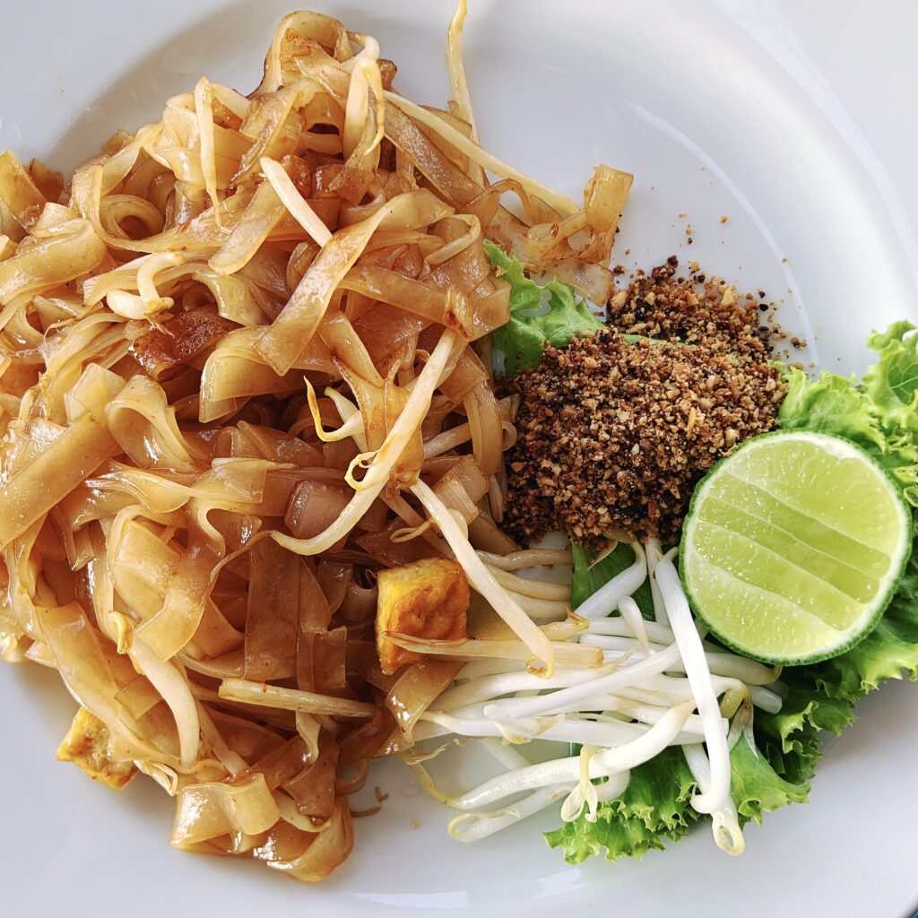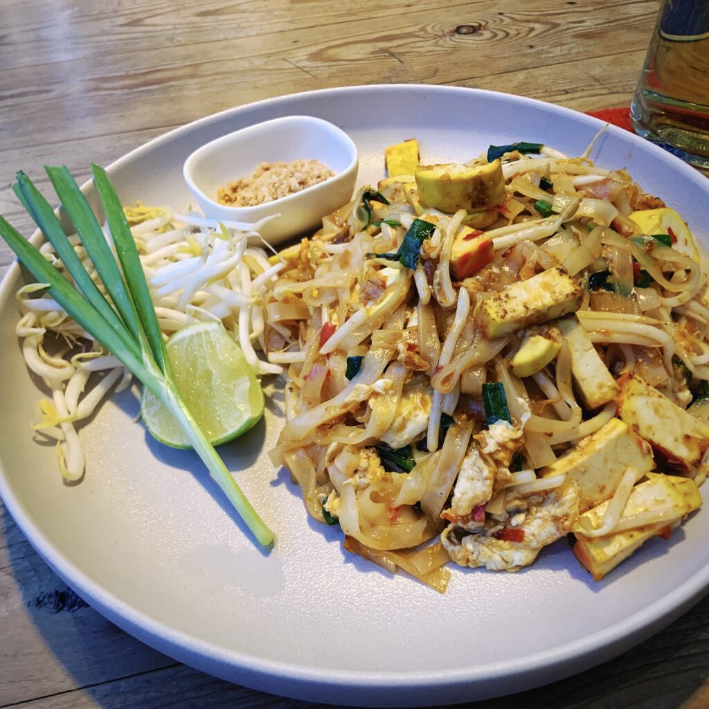 Kirjauduin sisään hotelliin ja lähdin etsimään sopivaa ruokapaikkaa. Ensimmäinen ravintola, DuLay Koh Larn tulikin vastaan vain noin 20 metriä huoneeni ovelta. Tutkin esillä olevaa ruokalistaa ja ilokseni listalla oli kokonaista 6 sivua otsikoitu nimellä ”Vegetarian Menu”! Osassa annoksista oli munaa, mutta muuten vaikutti varsin pätevältä. Tiasin pad thain, josta vaihdoin munan tofuun ja varmistin vielä, ettei siihen tulisi kala- tai osterikastiketta. Annos oli aika pieni, mutta eipä se maksanutkaan kuin 100 bahtia eli noin 2,70 €. Tofua siinä oli vaivaiset kolme palaa, mikä oli kyllä jokseenkin ankeaa. Maku oli kuitenkin mainio ja oluen kanssa nautittuna täytti vatsan kuitenkin ihan riittävästi.