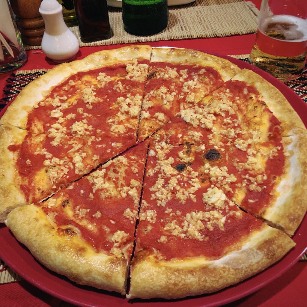 Syötyäni pari viikkoa pelkästään paikallista ruokaa alkoi mieleni tehdä pizzaa. Ihan majoitukseni liepeoltä löytyi italialainen ravintola Lido, joka tarjoili tietysti myös pizzaa. Ruokalistalta löytyi useita ”vegetarian” -annoksia, mutta niissä kaikissa oli juustoa. Hieman oudosti myös Marinara-pizzassa oli mozzarellaa. Käsittääkseni perinteisen Marinaran idea on juurikin siinä, ettei siinä ole juustoa.