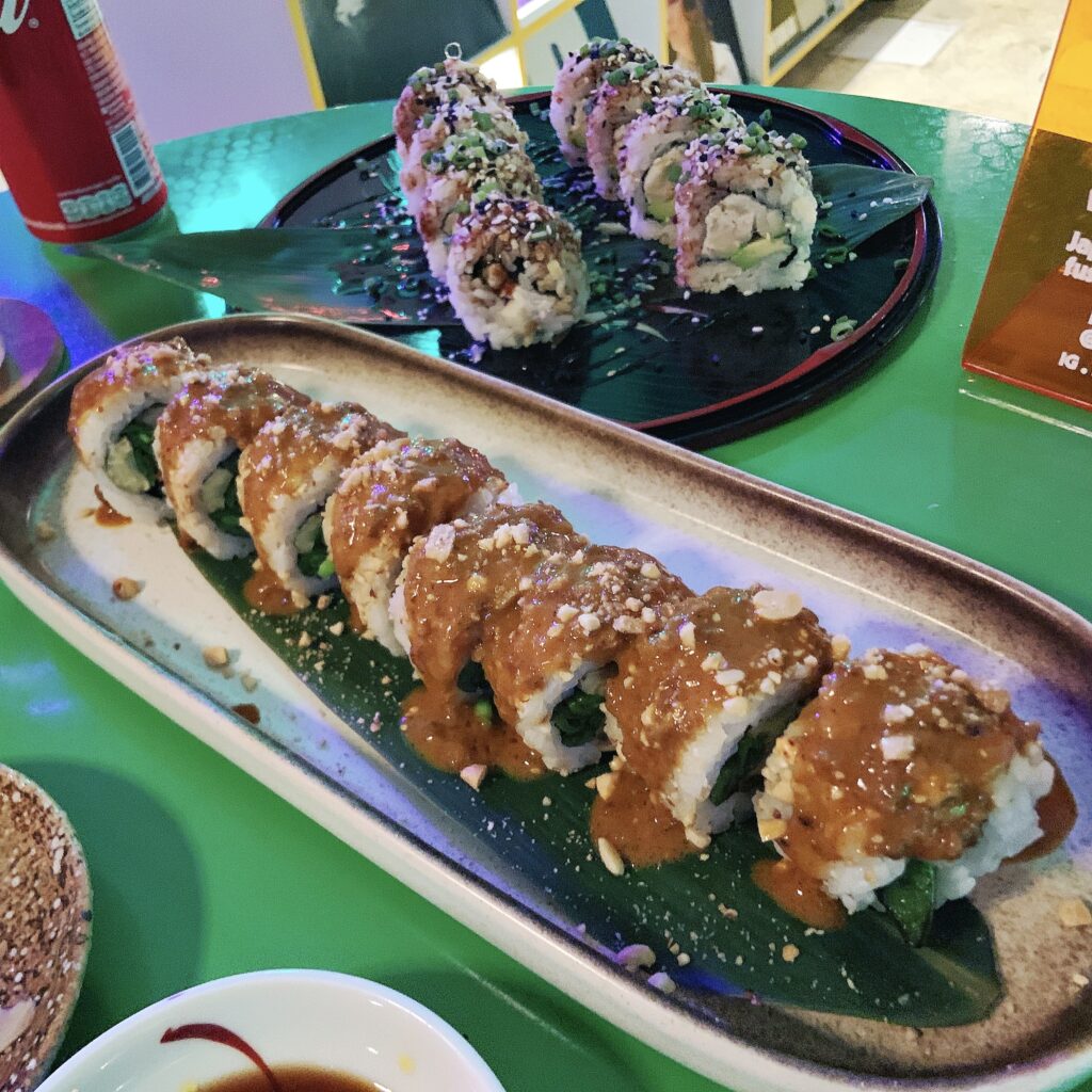 Listalta löytyi sushin ohella burgereita, tacoja, nuudeli- ja riisiannoksia sekä salaatteja. Sushi vaikutti kuitenkin olevan selkeästi tämän paikan omin juttu. Syötäväksi valikoitui kaksi erilaista 8 palan annosta, jotka maksoivat 380 bahtia eli noin 10 €/kpl. California-nimisessä oli täytteenä jakkihedelmää, avokadoa, kurkkua, manteleita sekä jonkinlaista avokadokastiketta. Rainbow on Satayn täytteinä oli rapeaksi paistettua tofua, maissia, vihreitä papuja, maapähkinää ja satay-kastiketta. Molemmat olivat kerrassaan upean makuisia. Kiva oma twistinsä näissä oli, mutta selkeästi olivat kuitenkin sushia.