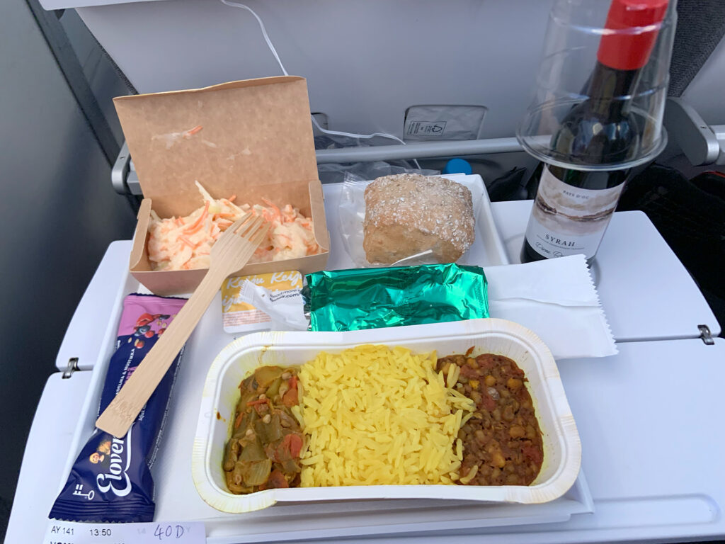 Olin etukäteen varannut itselleni vegaanisen kasvisaterian sekä meno- että paluulennolle. Aiempien kokemuksieni pohjalta vegaanisia aterioita ei saa läheskään kaikkien lentoyhtiöiden lennoilla, joten tämä oli ihan positiivinen yllätys. Edellisen talvipakomatkani Balille tein kiinalaisella halpalentoyhtiö Juneyaolla ja heidän valikoimista ei tainnut löytyä muuta vegaanista kuin olutta ja pähkinöitä. Onneksi Finnairilla vegaanit huomioidaan kuitenkin hieman paremmin.
