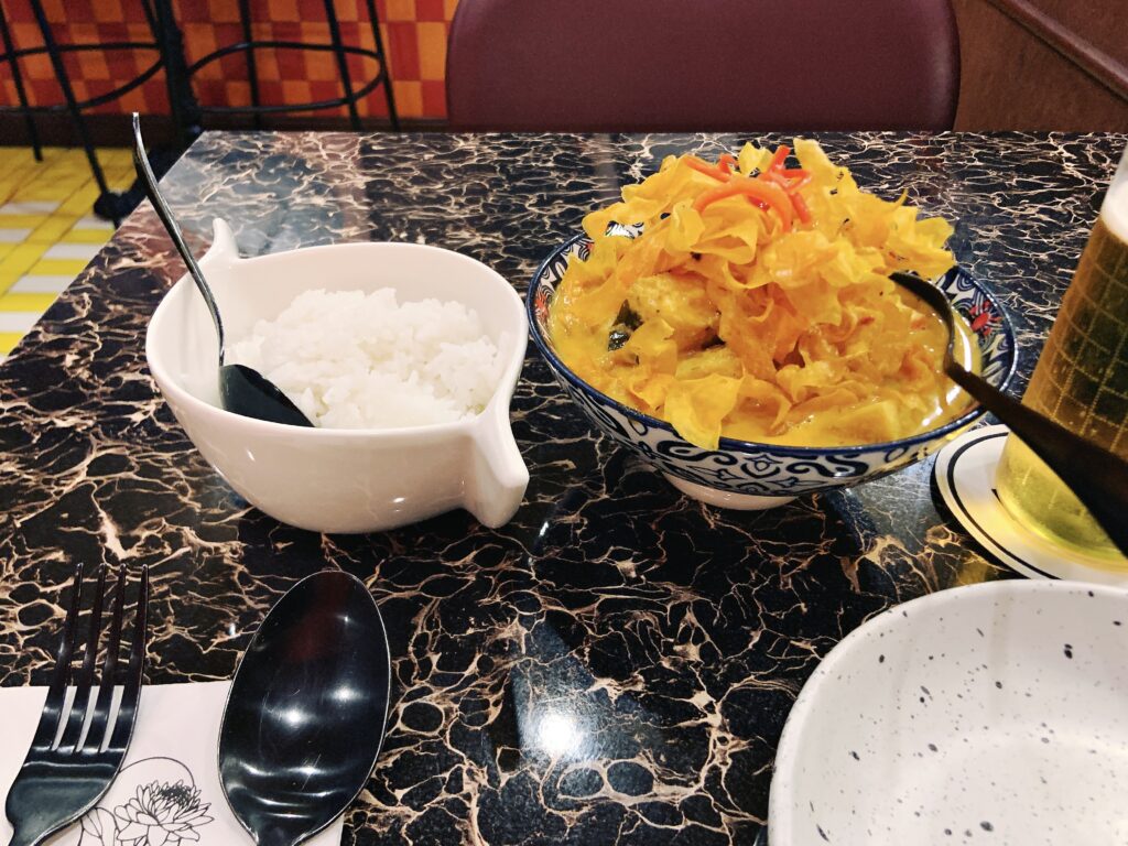 Koska nälkä oli jo kova, päätin mennä jälleen hyväksi havaitsemaani Tom’s Cafe & Restaurantiin. Tilasin vihreän tofucurryn ja eilisestä emämunauksesta oppineena varmistin vielä, ettei siihen vaan tule munaa eikä kala- tai osterikastiketta. Tarjoilija vakuutti, että ei tule. Tämäkin annos oli ihan superhyvä ja maksoi lisukkeeksi ottamani riisin kanssa 175 bahtia eli noin 4,80 €. Pisteet taas Tompalle!