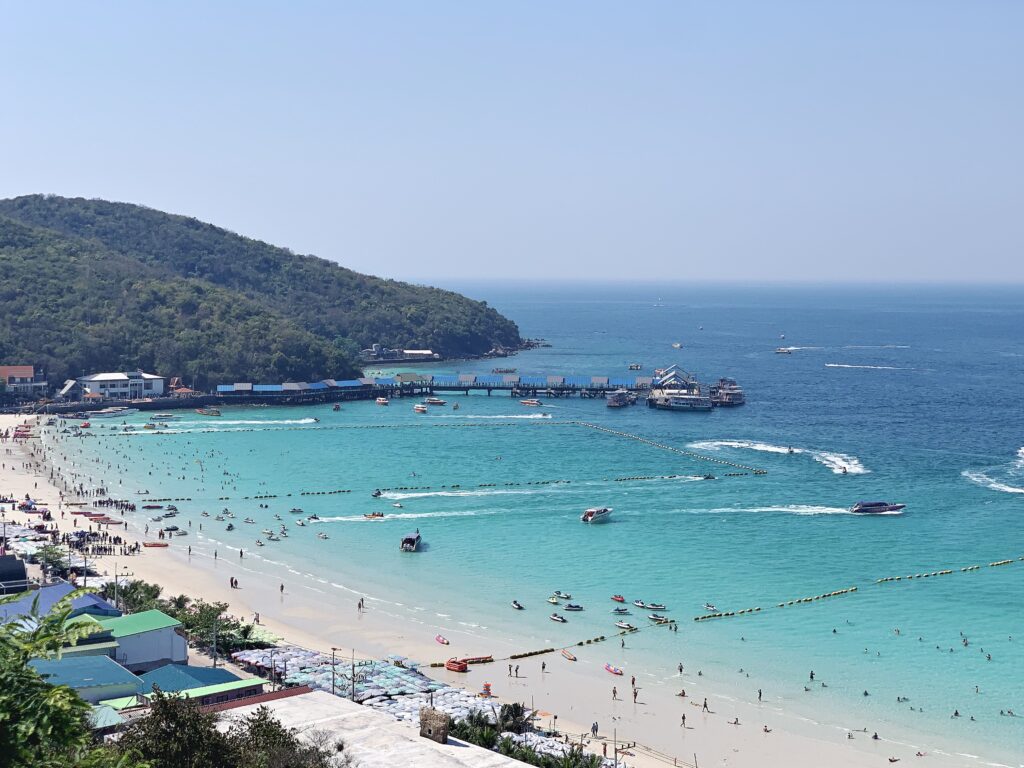 Lopulta bussi lähti 45 minuuttia myöhässä aikataulusta ja saapui noin kahden ja puolen tunnin kuluttua perille Pattayalle Bali Hain satamaan. Satamassa kysyin moneltako seuraava laiva lähtee ja lippuja myyvä miekkonen vastasi, että kahdelta. Totesin ystävällisesti, että kello on nyt 14:50, johon sain vastaukseksi ”ten minits, ten minits”! Selvä homma, ostin lipun (30 bahtia eli noin 0,80 €) ja hyppäsin paatin kyytiin. Laiva lähti toden totta 10 minuutin kuluttua ja oli perillä Koh Larnilla reilun puolen tunnin päästä. Ajatukseni oli kävellä siellä satamasta reilun kilometrin matka toisella puolen saarta olevaan majoitukseeni, mutta välissä oli inha nyppylä ja kapuamista olisi ollut korkeussuunnassa 40 metriä. 33 asteen helteessä se ei tuntunut kovin mieluisalta ajatukselta, joten otin mopokyydin. Ei sekään kovin mieluisaa ollut, etenkin ilman kypärää ja kuskin kaahatessa varsin vauhdikkaasti. Pääsin kuitenkin perille nopeasti ja ehjänä. Nälkä alkoi olla kova, sillä olin syönyt ainoastaan aamupalan ennen bussille lähtöä.
