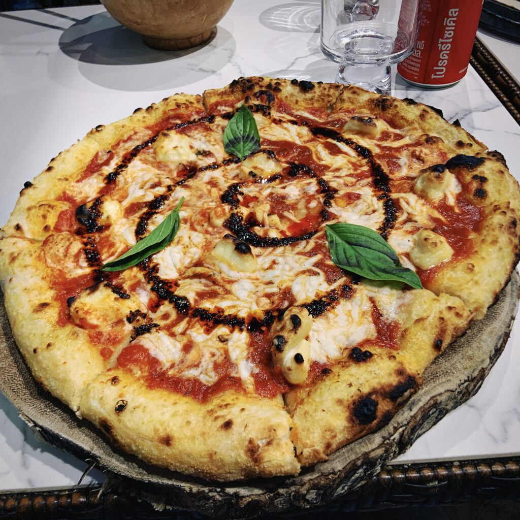 Koska edellinen syömäni pizza oli ihan totaalisen kauhea, toivon mukaan saisin nyt syödä hyvää vizzaa. Oikeastaan kaikki listan vaihtoehdot vaikuttivat varteenotettavilta ja niitä oli tarjolla kahdessa koossa, 9- ja 12-tuumaisina versioina. Päädyin lopulta aika perusmalliseen El Classicoon 12-tuumaisena. Siinä oli täytteenä tomaattikastikkeen ja perusvuuston lisäksi ainoastaan jonkin sorttista vegaanista buffalomozzarellaa. 300 bahtin eli noin 8 € hinta tuntui paikalliseen hintatasoon suhteutettuna varsin korkealta, vaikka toki Suomessa tällaisesta pizzasta saa pulittaa vähintäänkin kaksinkertaisen hinnan.